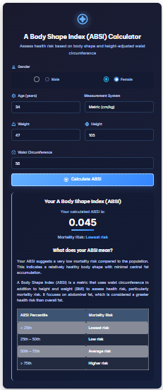 Looking beyond BMI for a more accurate health risk indicator? Our ABSI Calculator (A Body Shape Index) evaluates your body shape using waist circumference, height, and weight to provide a powerful predictor of mortality risk. Unlike traditional BMI, ABSI accounts for fat distribution patterns and identifies dangerous visceral fat that increases your risk for serious health conditions. Discover how this advanced metric offers superior health risk assessment and why your waistline might be more important than the number on your scale.