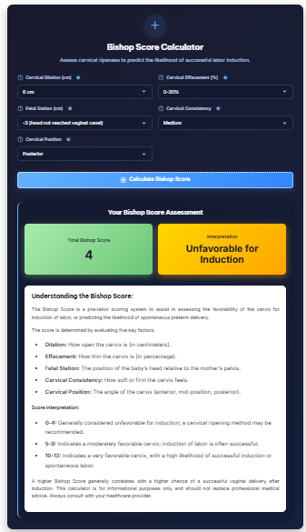 Wondering if your body is preparing for labor? Our Bishop Score Calculator helps healthcare providers and expectant parents assess cervical readiness for labor and predict the likelihood of successful labor induction. This clinical tool evaluates five key factors to generate a score between 0-13, providing valuable insights into whether your body is naturally preparing for childbirth or may need assistance. Understand this important obstetric assessment and how it guides decisions about induction timing and methods.